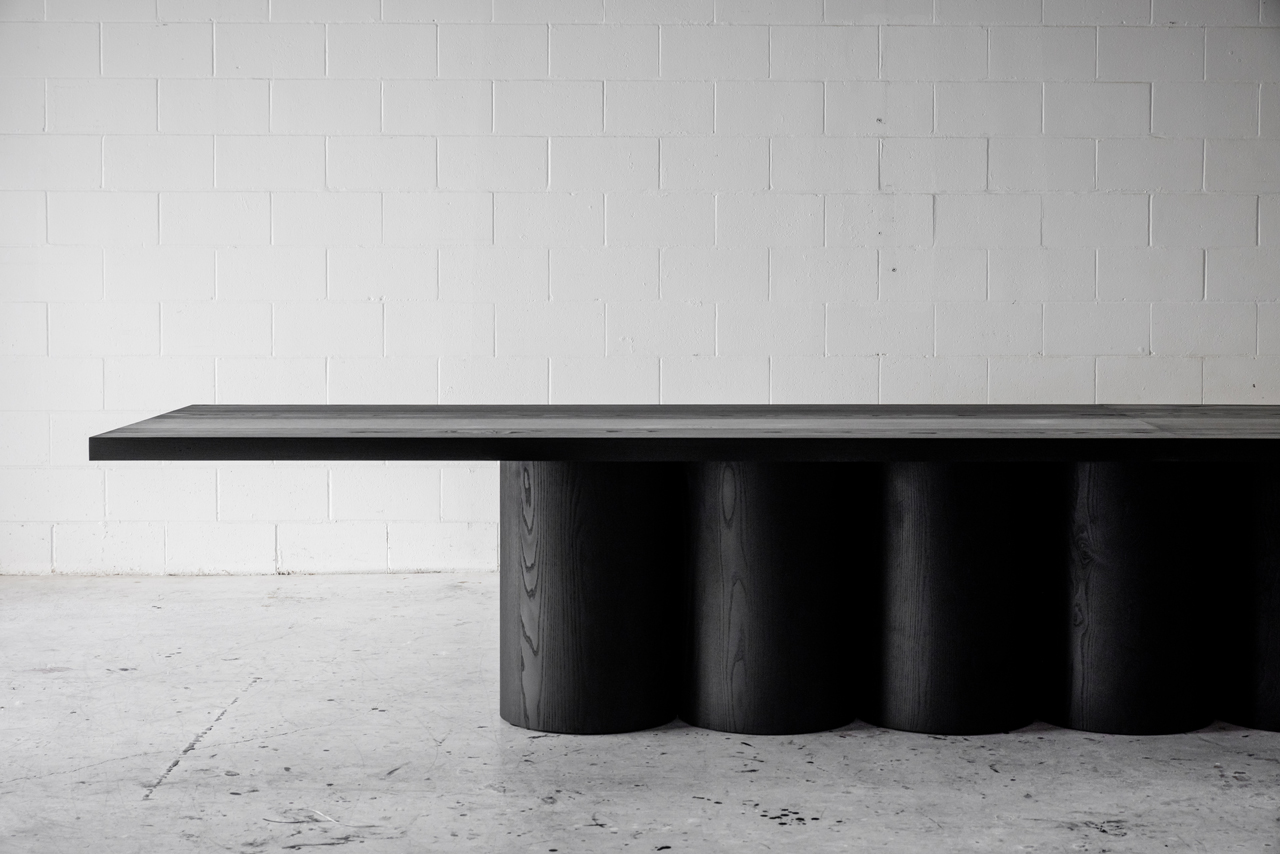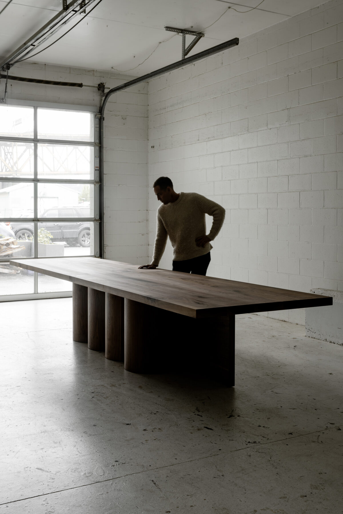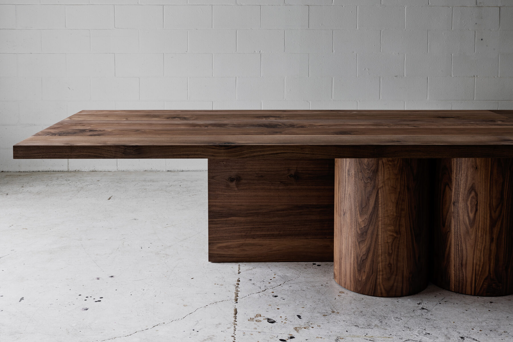 A monumental furniture piece designed around mulitple large diameter, lathe turned solid wood support columns. Hand-crafted from solid 2.25″ thick hardwood.