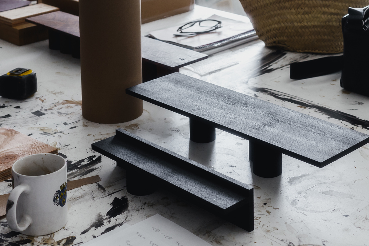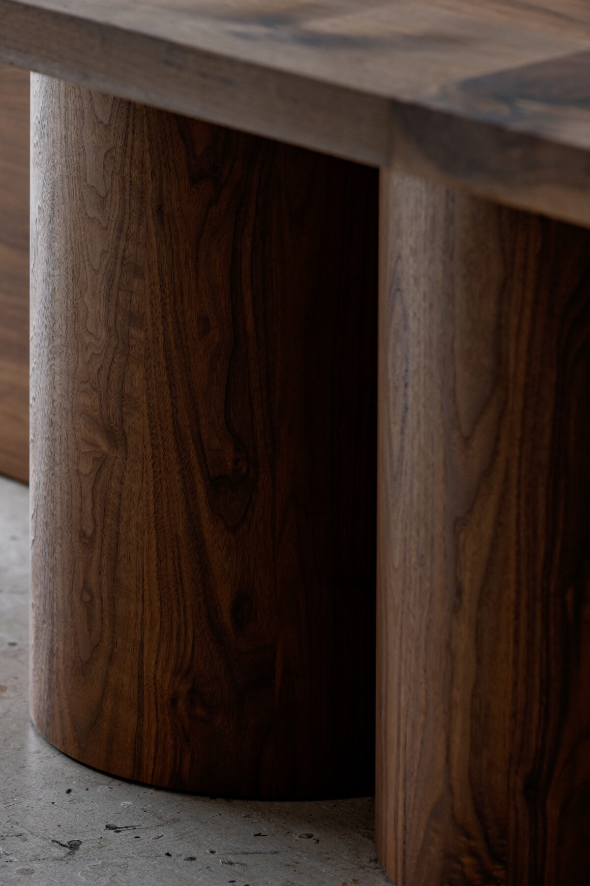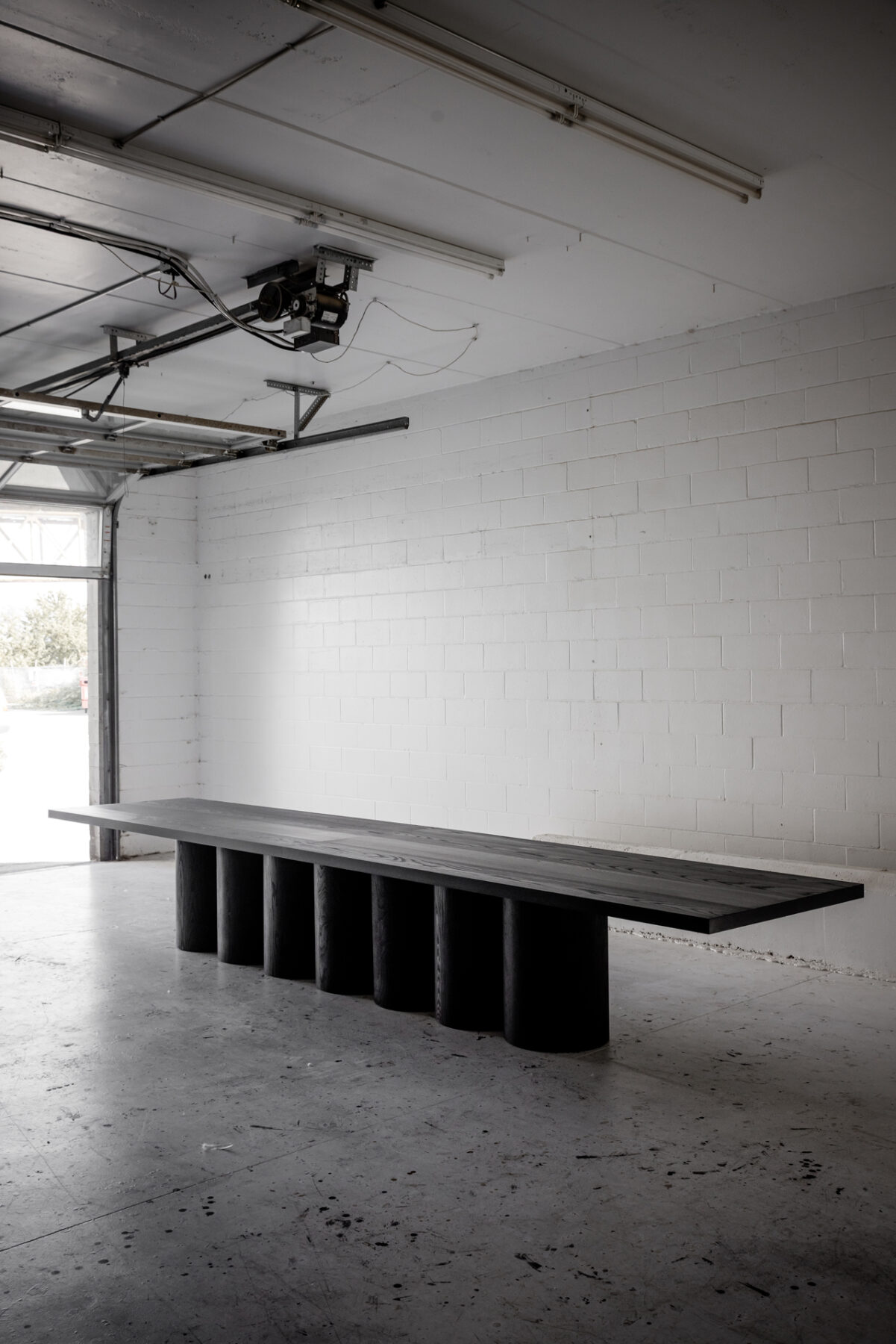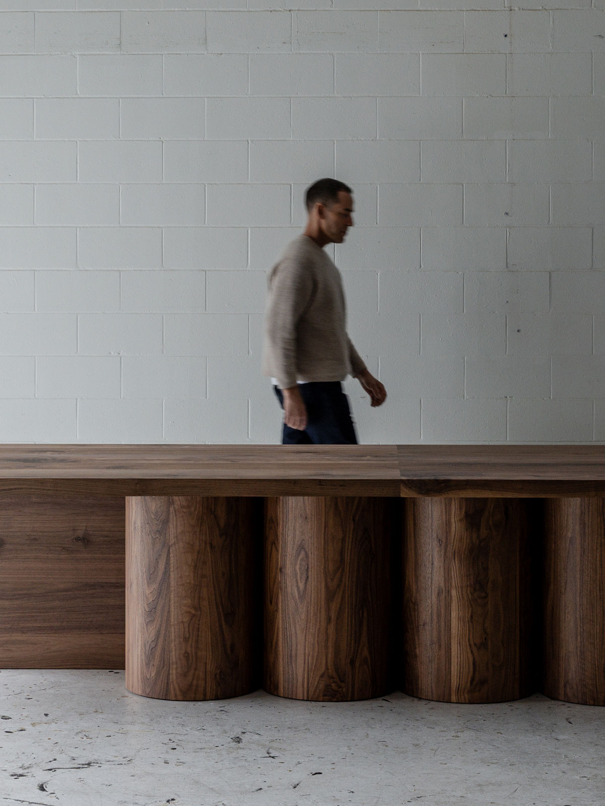 A monumental furniture piece designed around mulitple large diameter, lathe turned solid wood support columns. Hand-crafted from solid 2.25″ thick hardwood.