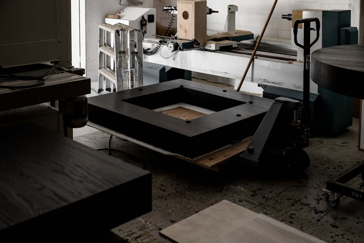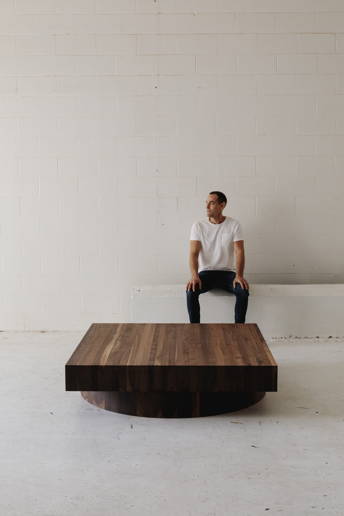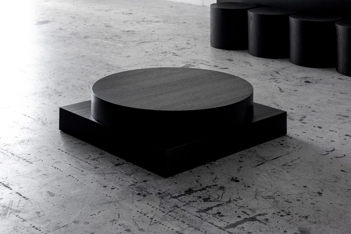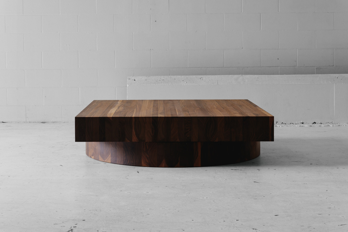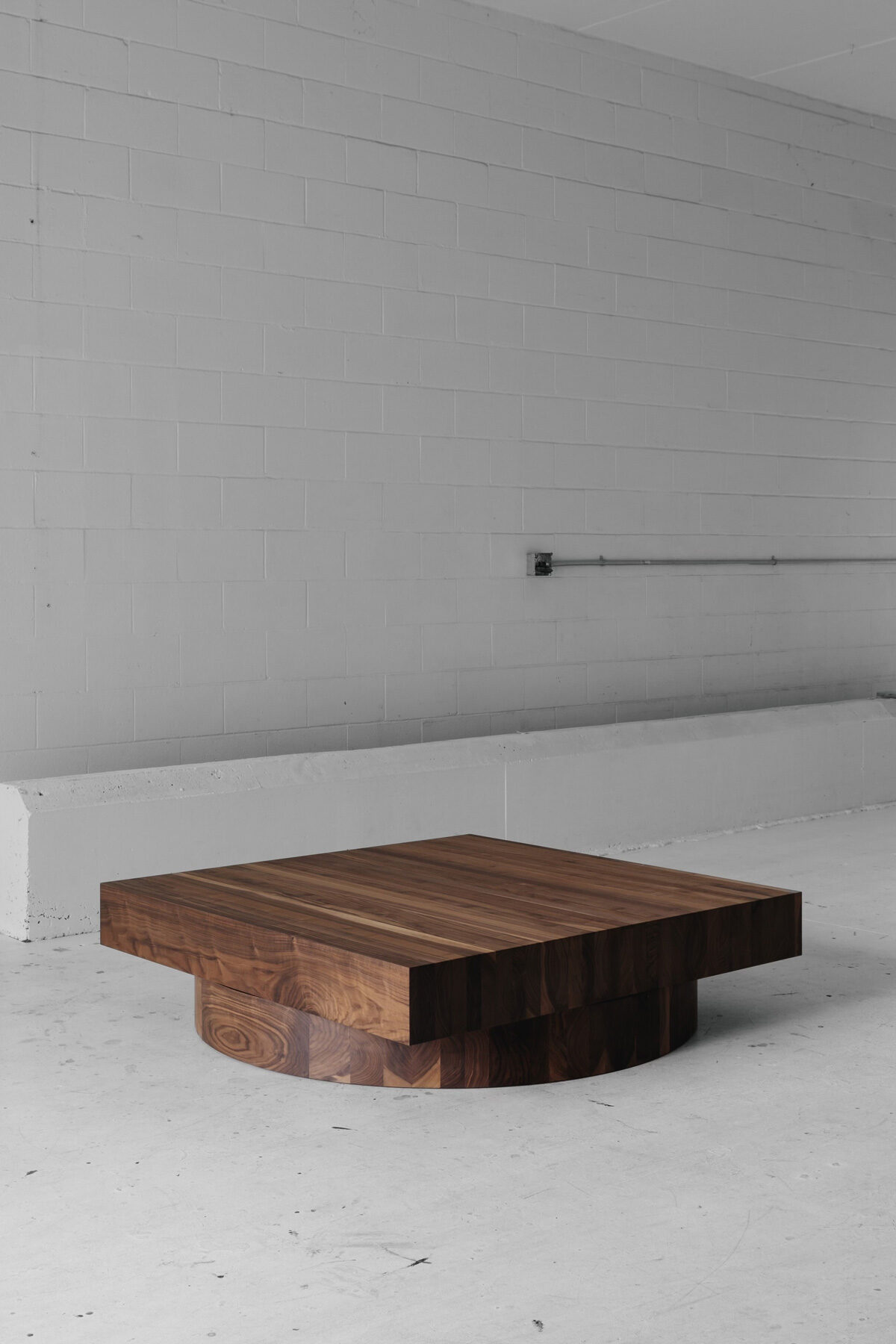A sculptural coffee tables influenced by wood block compositions. A stacked, handcrafted wood turned cylinder and cube.